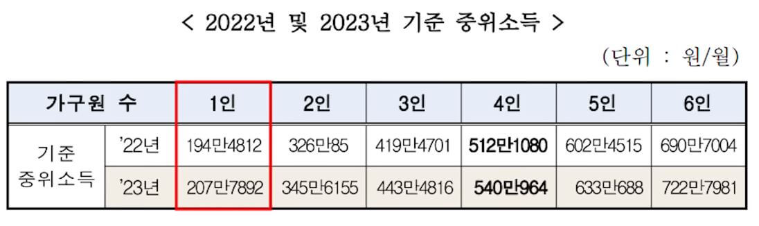 위 내용을 보시면 더욱 쉽게 이해할 수 있으신데요. 22년 1인가구 기준 중위소득이 194만 원이었다면, 23년도는 약 207만 원인 것을 확인할 수 있습니다.