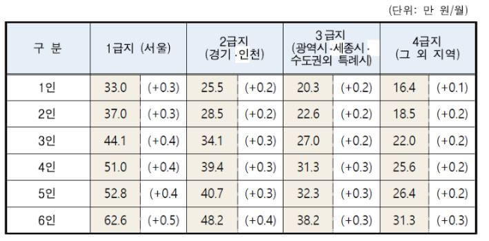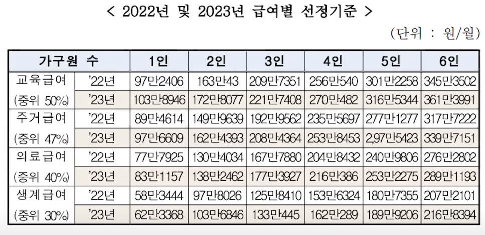 위 표를 보면 22년도와 23년도 급여비가 확 달라진게 보이실텐데요. 중위소득이 인상됨에 따라 자연스럽게 생계 급여비 또한 인상된 겁니다.