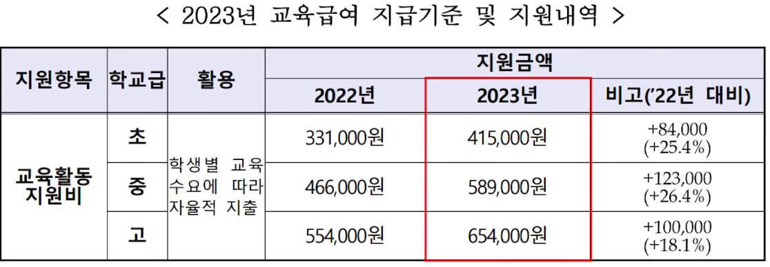 우선 현금으로 지급되던 교육급여는 23년 3월부터 바우처로 개편됩니다. 교육활동지원비가 올해 대비 23%나 증가하여, 초등학생은 41만원, 중학생은 58만원, 고등학생은 65만원을 지원해드립니다.