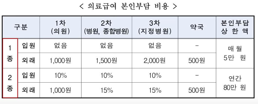 근로능력 유무에 따라 1종과 2종으로 구분되는데, 종에 따라 본인부담상한액이 다르고 한도에 맞게 병원과 약국에서 혜택을 누릴 수 있습니다.